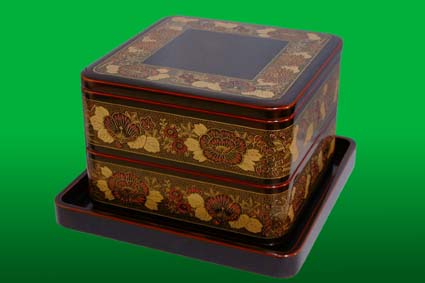溜塗草花紋沈金二段重 26cm×26cm16cm